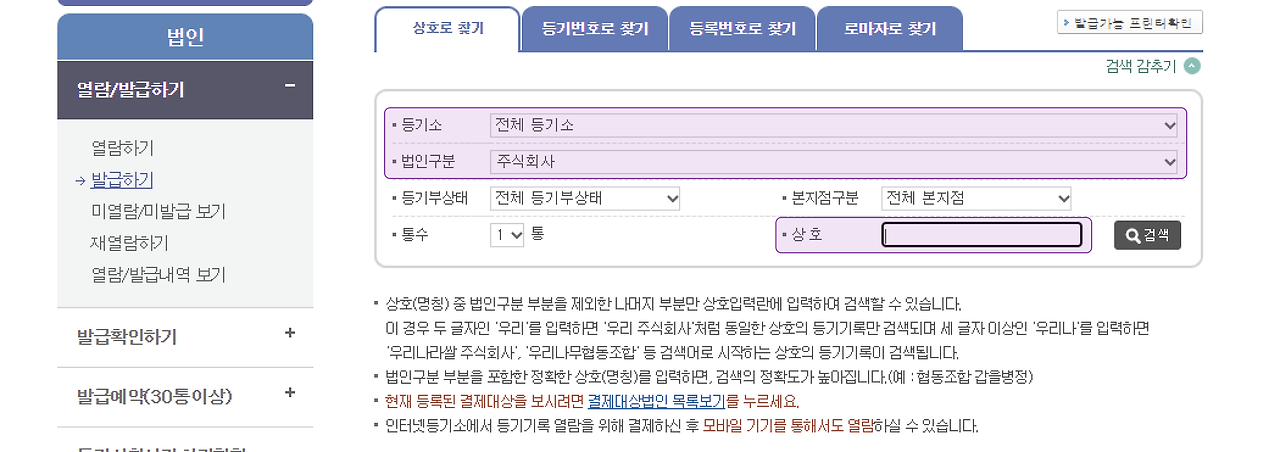- 발급받고자 하는 법인의 상호 또는 등록번호