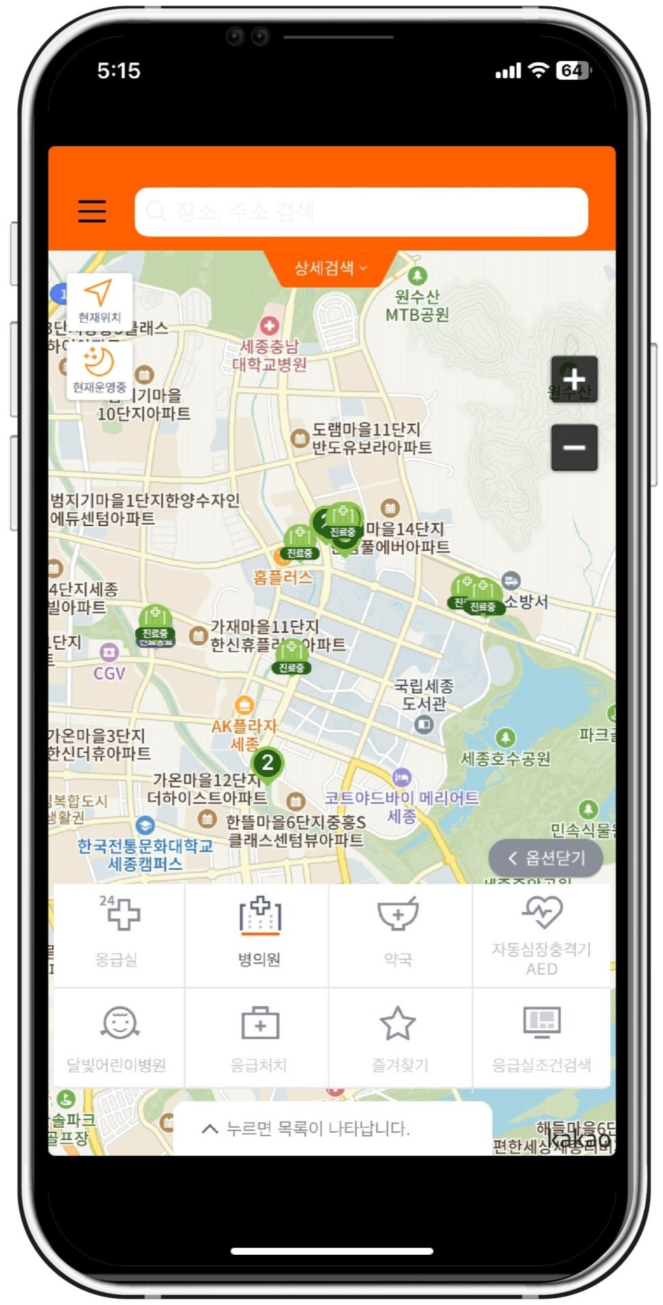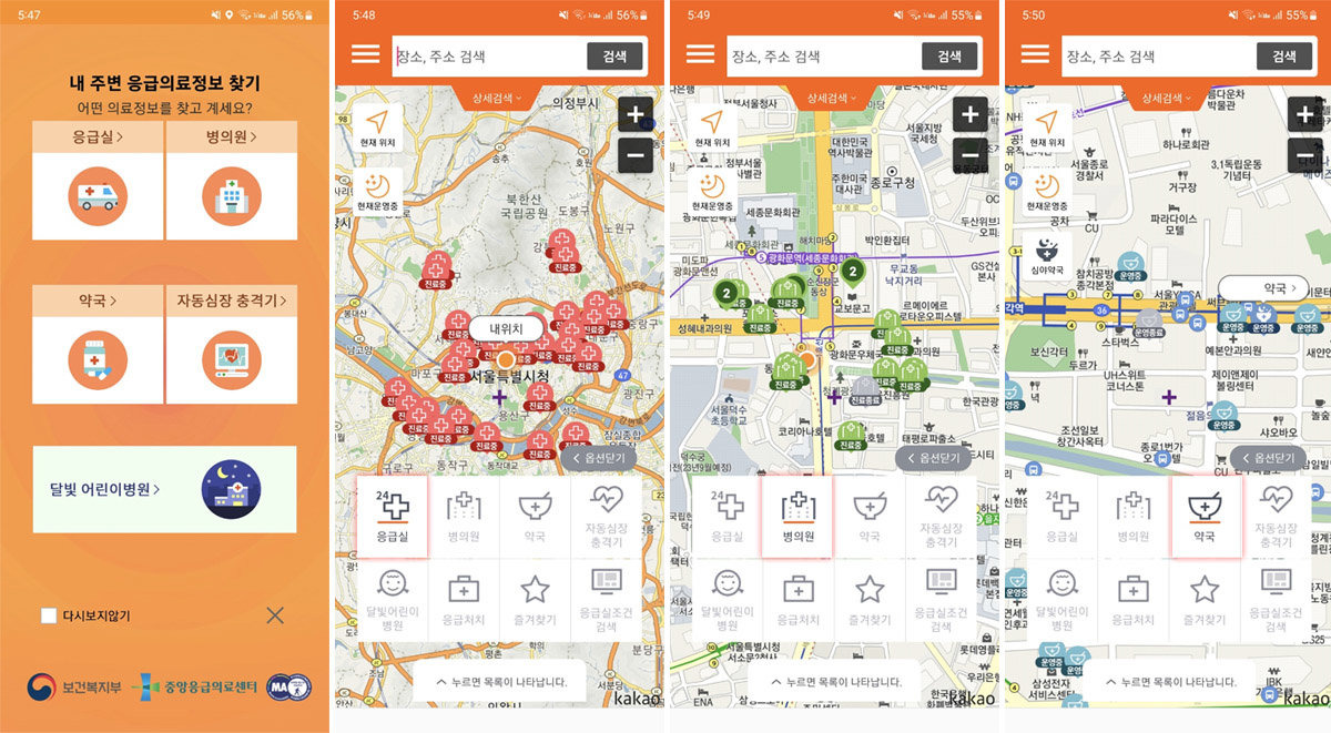 보건복지부에서 제공하는 E-Gen 앱은 사용자의 위치를 기반으로 주변에 문 여는 병의원과 약국을 지도로 보여주고 진료시간이나 진료과목 조회도 가능합니다.