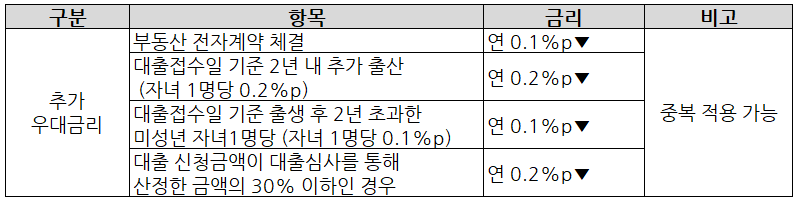 신생아 특례 버팀목 전세자금 대출금리는 아래와 같으며 항목에 따라서 금리인하가 가능하며 우대금리 적용후 최종금리가 1.0%미만인 경우 연 1.0%까지 가능하오니 최대한 우대금리 혜택을 꼭 받아보시기 바랍니다.