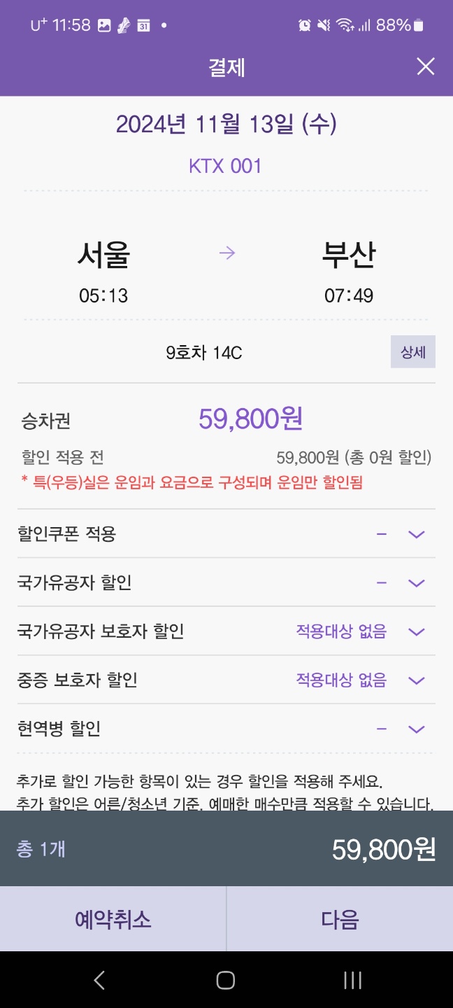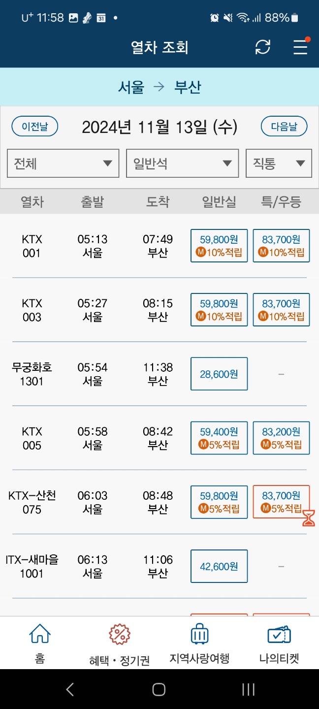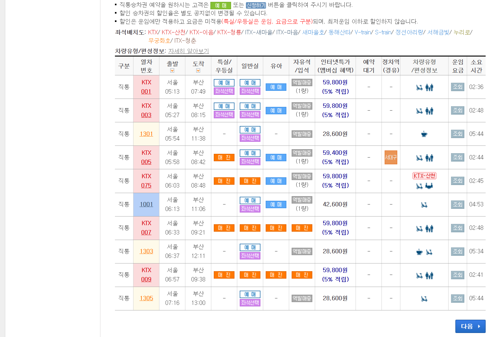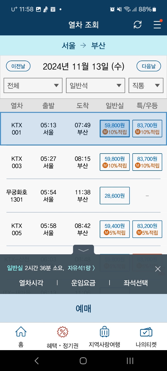 - 각 열차 종류별 시간대에 맞는 기차표가 나오는데 일반실, 특/우등실 구분되어 있으니 원하시는 종류를 선택합니다.