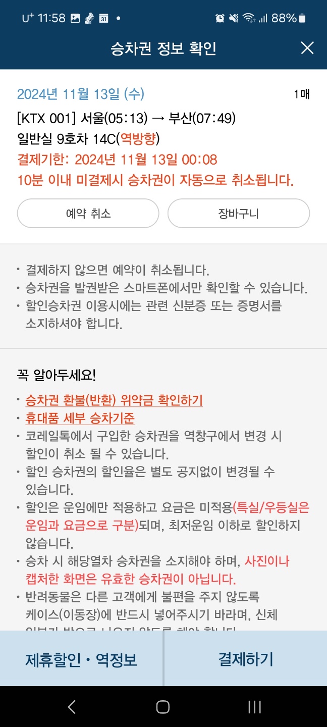 - 선택 완료 버튼을 누르고 승차권 정보를 확인하신 다음 결제하기 버튼을 누르시면 됩니다.