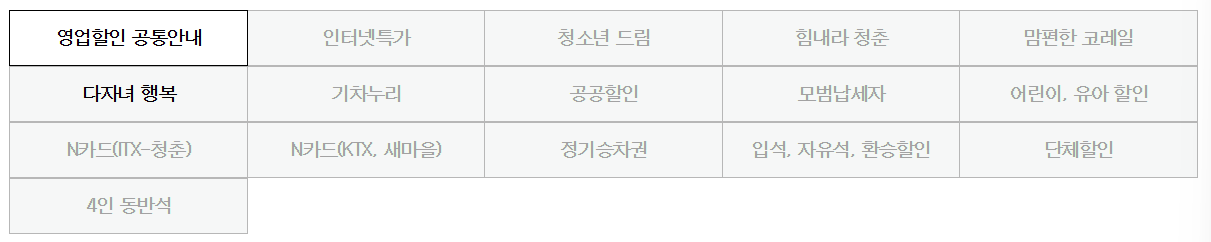 코레일에서는 많은 할인을 제공하고 있는데 그 중에서도 대표적으로 인터넷특가/ 청소년드림/ 힘내라 청춘/ 맘편한 코레일/다자녀 행복/기차누리 할인 등이 있습니다.
