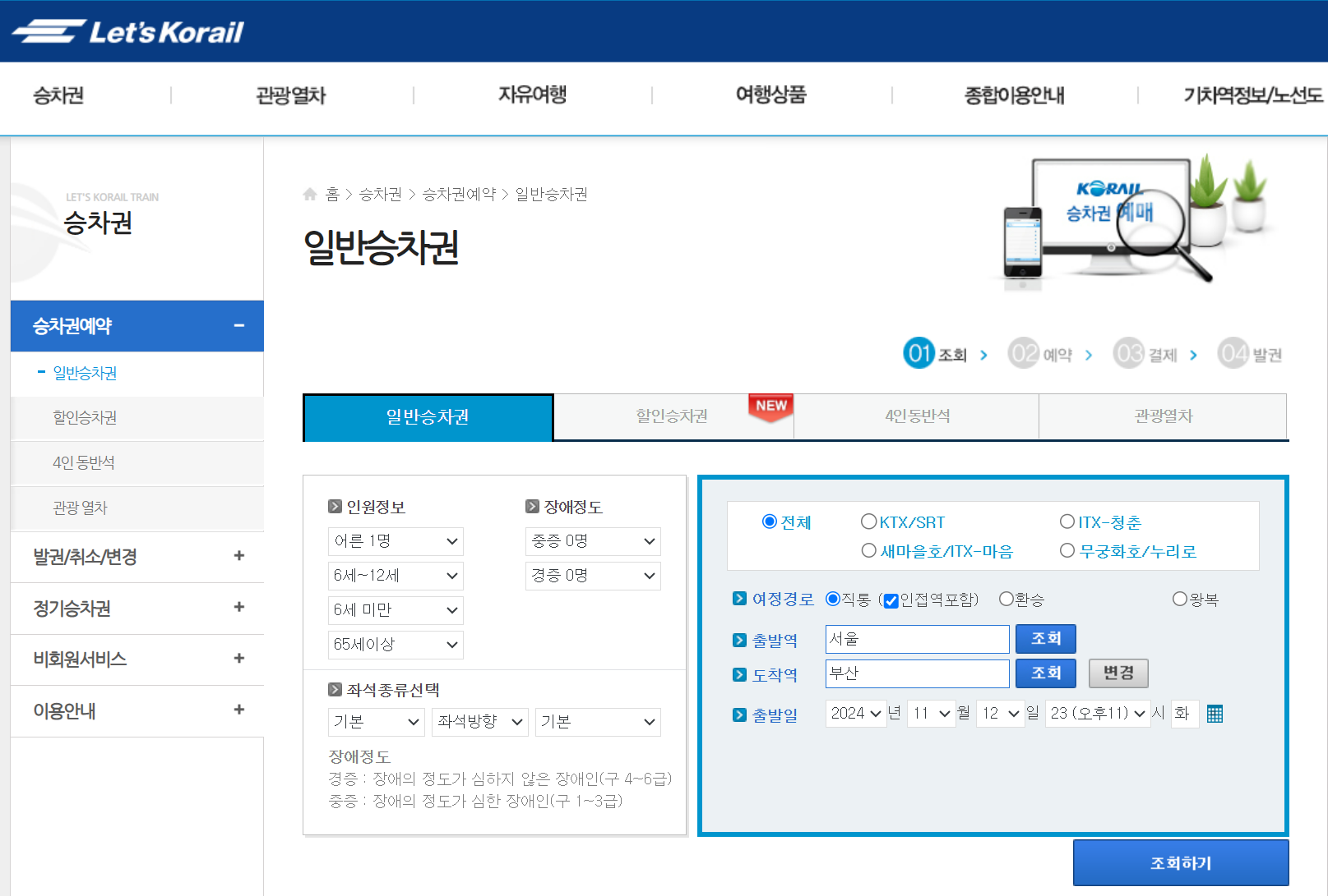 - 코레일 홈페이지에서 일반승차권을 선택하고 인원 정보와 좌석 종류 그리고 기차 종류와 출발, 도착역을 선택하시고 원하시는 출발 시간대를 선택하시면 조건에 해당하는 기차표가 나옵니다.