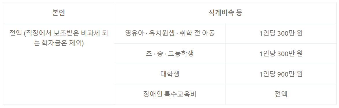 교육비 세액공제는 본인의 교육비와 직계비속의 장애인 특수교육비는 전액 세액공제가 되고, 이 외는 아래와 같이 세액공제 한도가 정해져 있습니다.