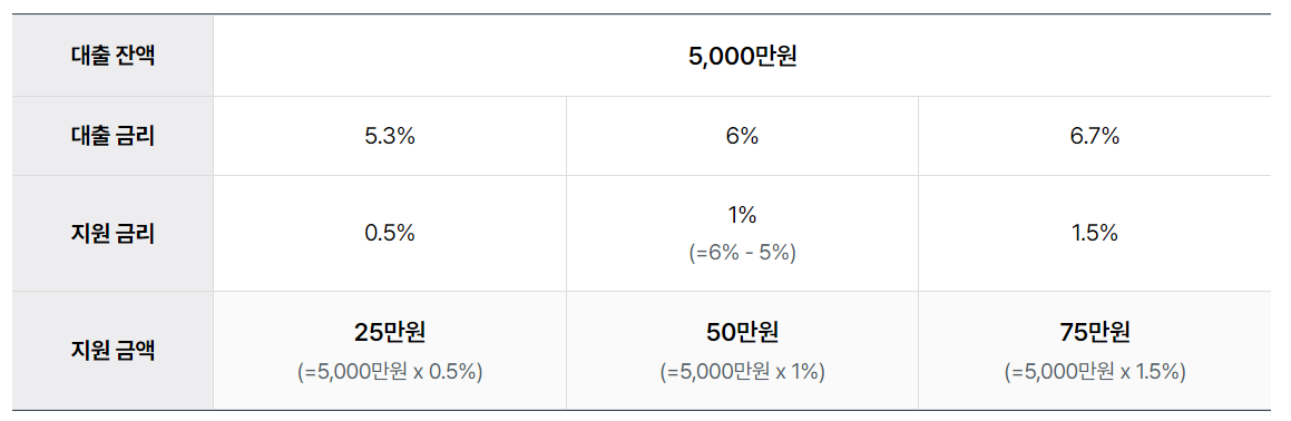 - 이자 환급, 지원금액은 대출잔액 x 해당 금리구간 지원 이자율
