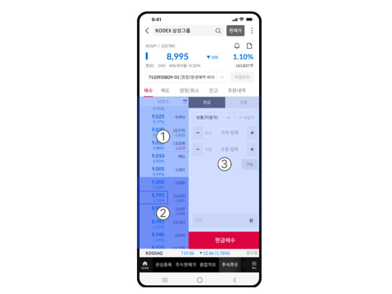 선택한 ETF 종목을 매수/매도가 가능하며 내가 주문하고자 하는 방식, 주문수량, 주문금액을 설정하여 매매가 가능합니다.