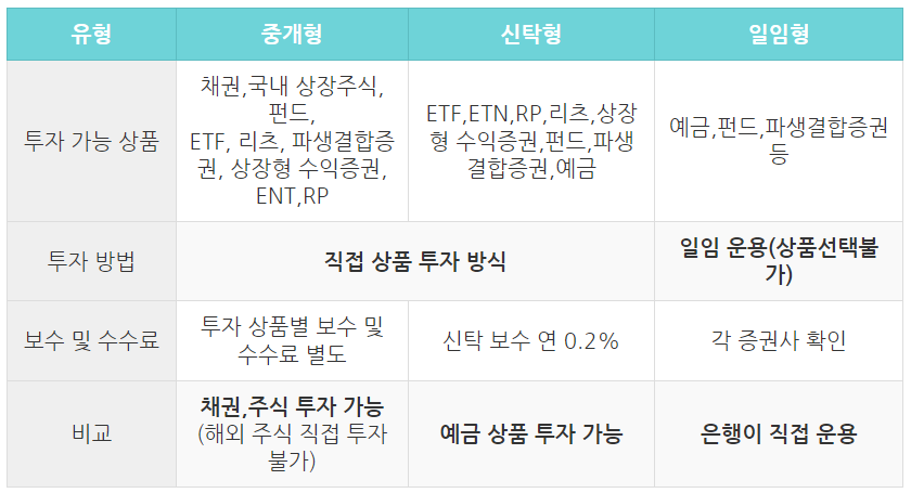 이전 글에서도 설명드렸듯이 ISA 계좌 종류는 중개형, 신탁형, 일임형으로 나뉘어져 있으며 투자를 직접할 수 있고, 보수 및 수수료가 많이 들지 않으며 다양한 상품에 투자가 가능한 중개형이나 신탁보수 수수료가 일부 들어가지만 예금 상품에 투자가 가능한 신탁형이 있습니다