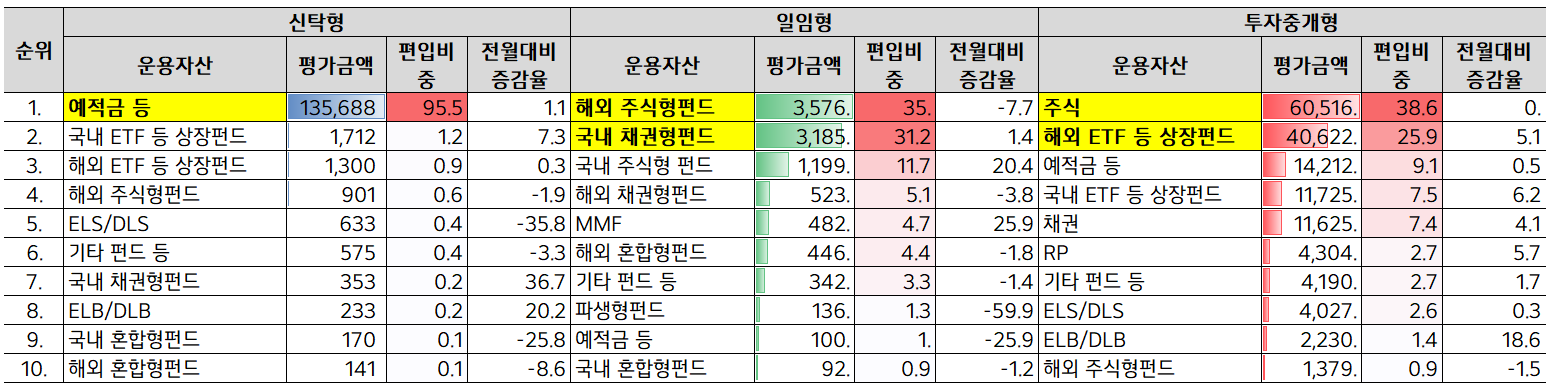 ISA 계좌 종류별 운용자산 종류별 현황 확인해본 결과 신탁형은 예적금이 95.5%로 압도적으로 많고, 일임형은 주식형, 채권형 펀드가 82%를 차지하고, 중개형은 주식과 상장펀드에서 72% 정도를 차지하고 있습니다.