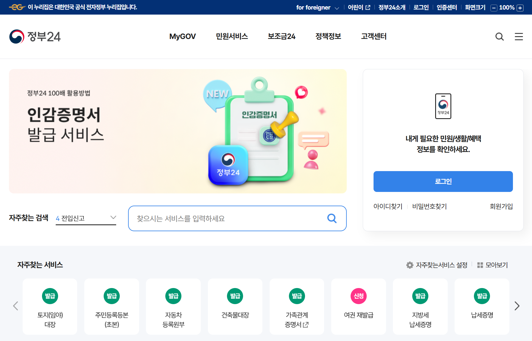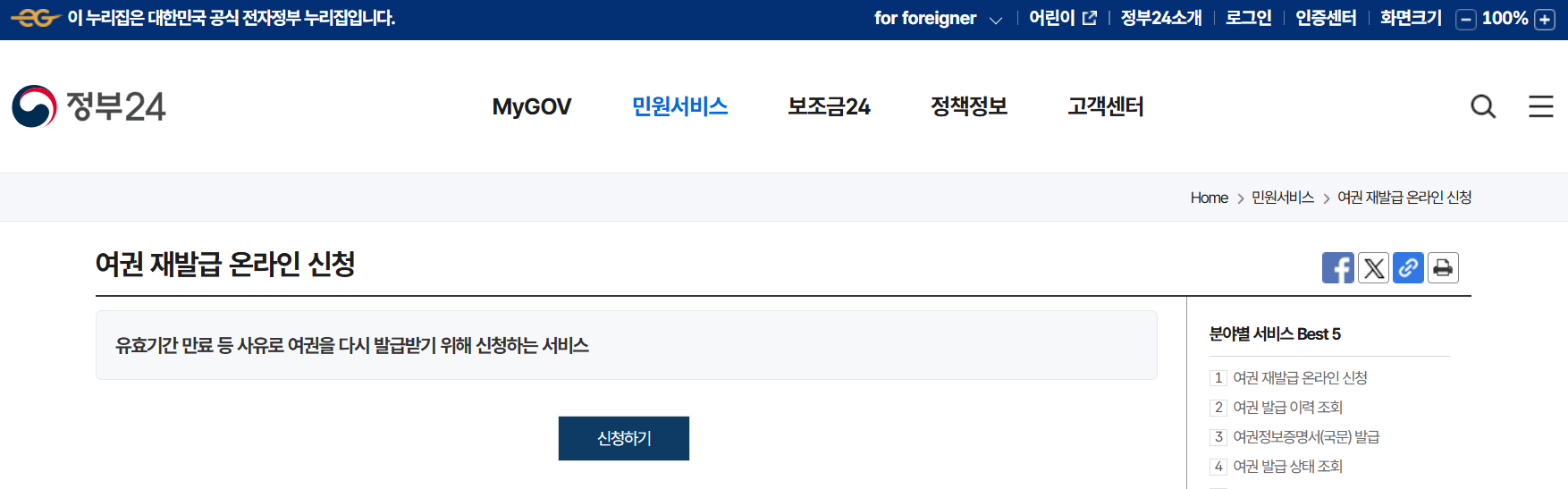 여권 발급 온라인 신청 바로가기 1.정부24 홈페이지에서 여권재발급 신청을 검색하거나 자주찾는 서비스에서 여권 재발급을 누릅니다.