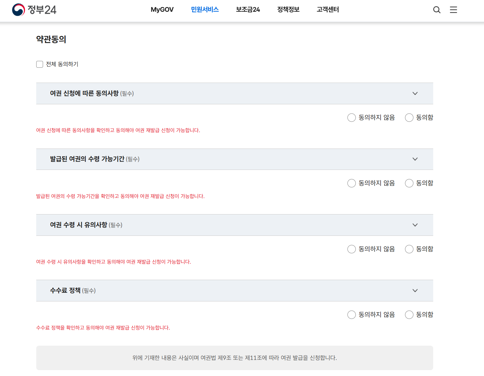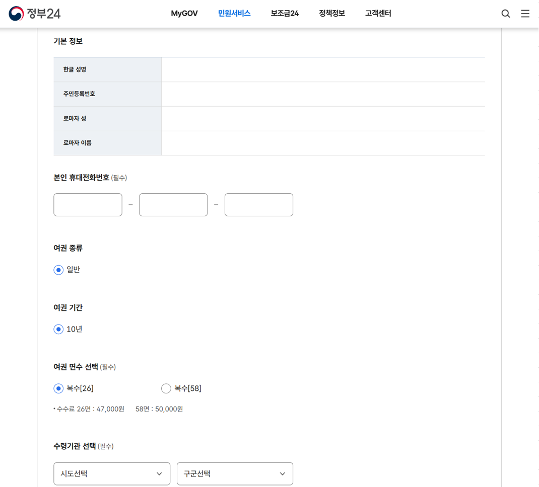 3.약관에 동의를 하고 기본 정보 및 여권 종류, 기간, 면수를 확인하고 수령기관을 선택합니다.