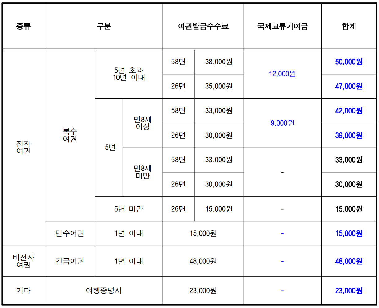 여권은 종류(복수,단수)와 기간(5년,10년), 발급 면수에 따라서 가격이 다르니 각자 상황에 맞는 여권을 발급하시면 됩니다.